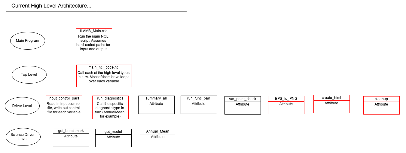 The current architecture has three to four layers above the main science code. The science code mixes science operations with plotting. The main level has loops over variables processed for each different type of processing (over the run_diagnostics procedure for example).