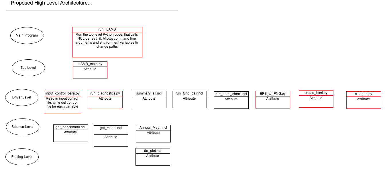 Propose turning "red" boxes above into Python. Have Python handle reading of text control files, and system calls, and NCL do the science and plot creation. Python has more ability and flexibility in handling text and system calls. Python can also handle the multi-processing (using the mpi4py package). Each variable and each type of processing can be on a different processor. The main idea is to put the Python script at the top, and then gradually, let it move "downwards" and take over more high level responsibility.